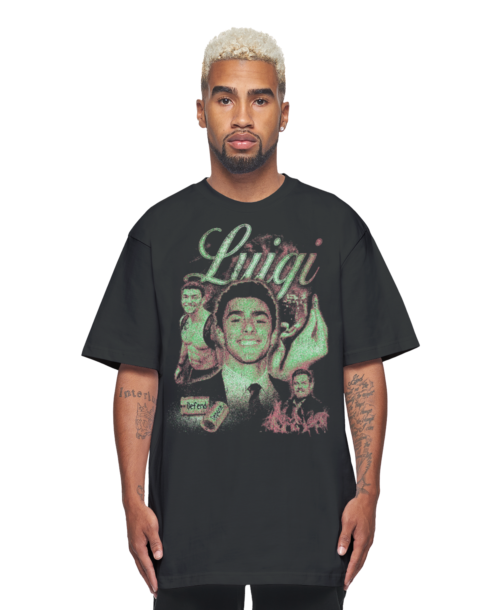Printed on a premium oversized wash dyed black shirt. Moderate thickness.